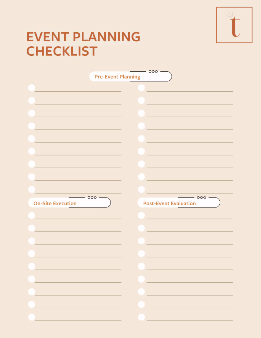 Lots goes into event planning and there’s typically three stages: pre-event planning, on-site execution, and post-event evaluation. Below, I provided a checklist to make your own list while you’re planning. No event is the same, but here’s also some ideas of the various tasks you will want to check off: