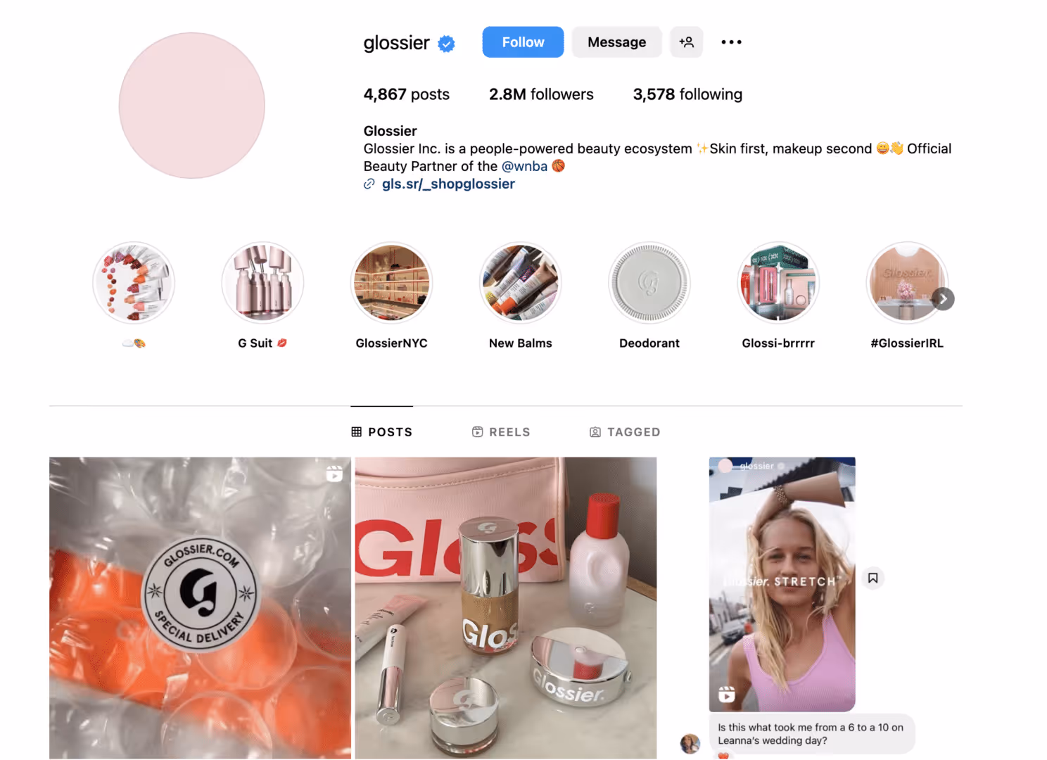 On platforms like Instagram, Glossier's profile picture features their iconic minimalistic logo, making it instantly recognizable amidst a sea of posts. Their bio succinctly communicates what they represent, and has a fun combo of emojis and catchy taglines. Glossier's profile link also leads directly to their online store, ensuring that interested users can seamlessly transition from their social media presence to making purchases. This convenience plays a pivotal role in optimizing the customer journey.
