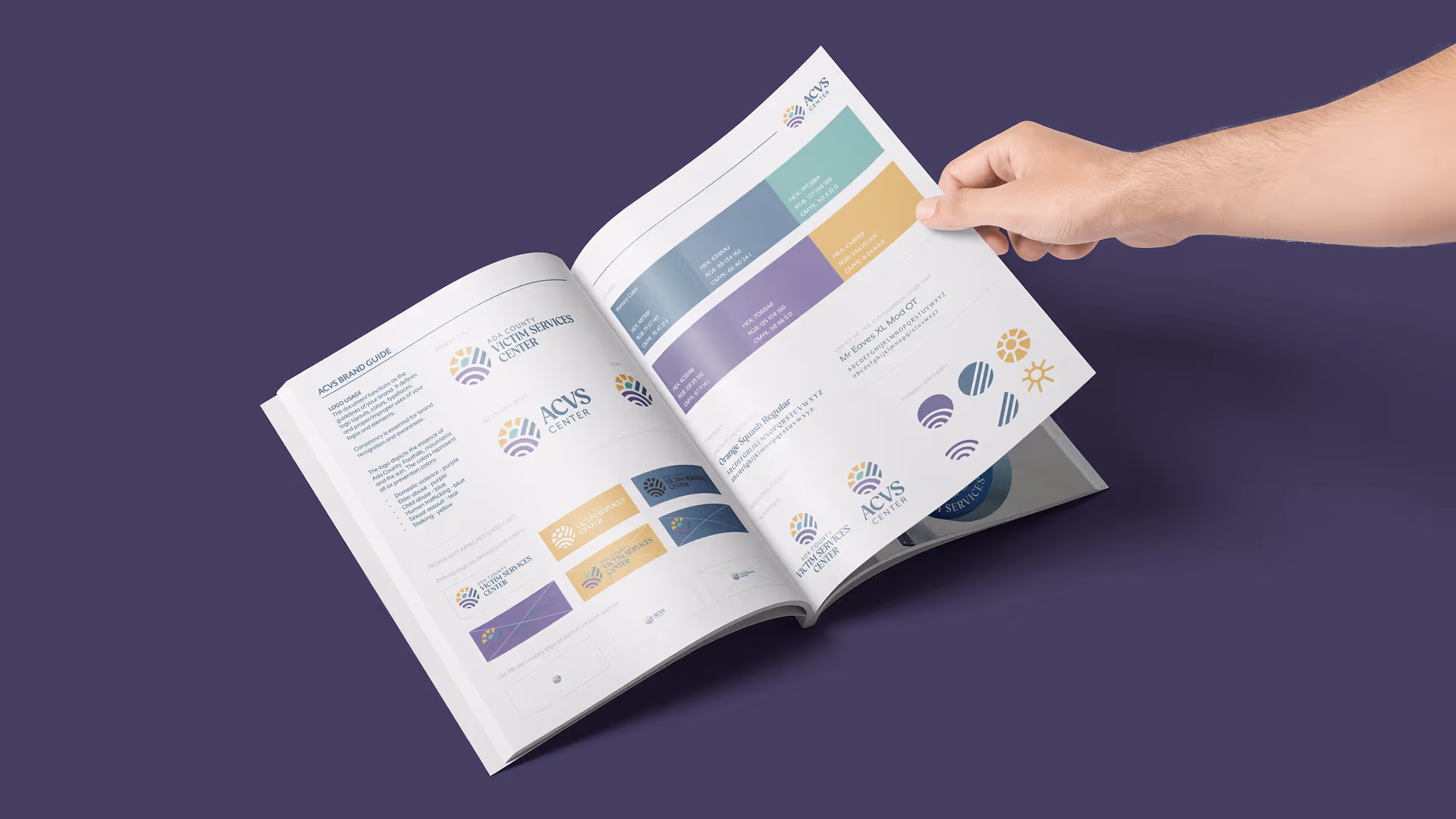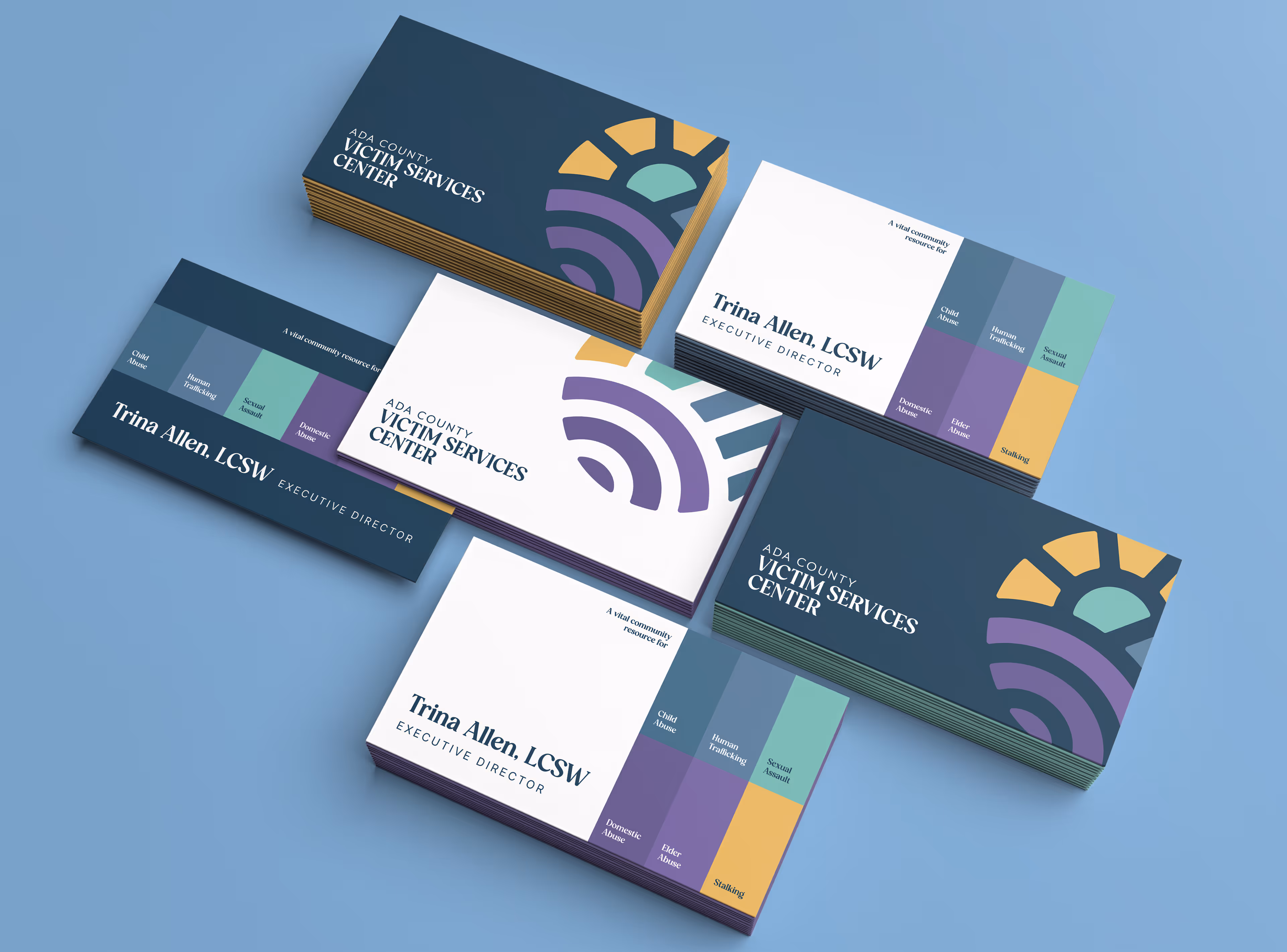 The final logo and branding featured a harmonious blend of the standardized “prevention colors,” with blue representing human trafficking, purple representing domestic abuse, and so on. Additionally, we incorporated meaningful symbols like a sun rising over mountains to reflect the center’s commitment to overcoming challenges and inspiring hope. The sun, mountains, and hills also paid homage to their location in the Treasure Valley. By uniting these elements, our team brought the center’s vision to life through a powerful and resonant brand identity.